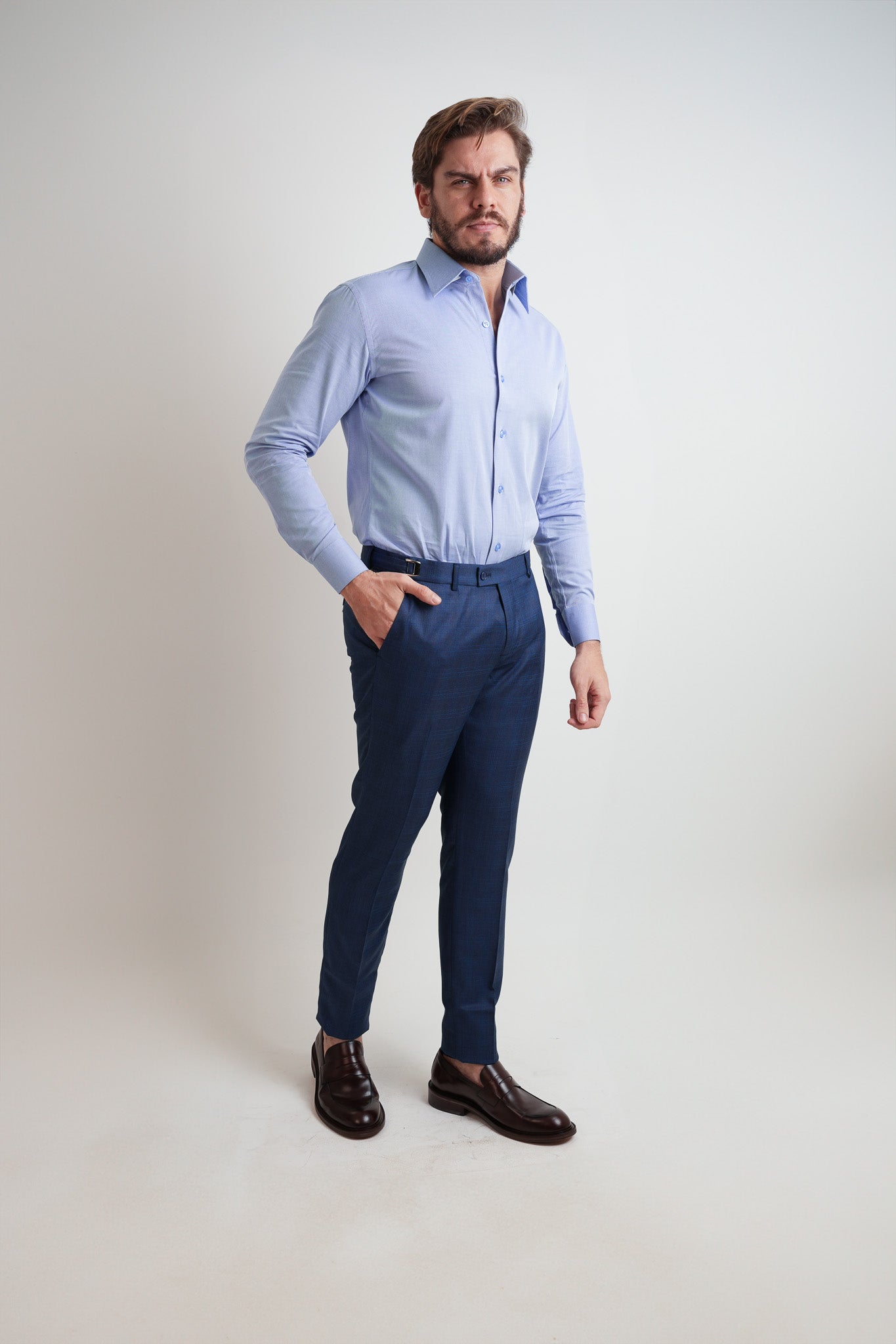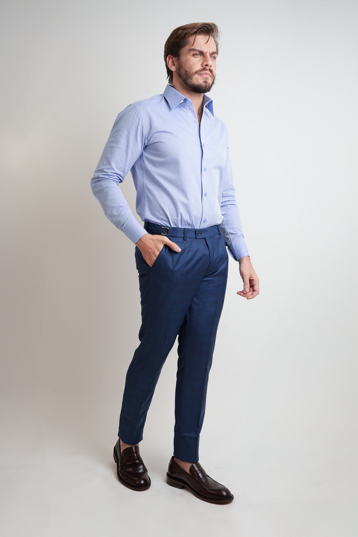 Calça Prícipe de Gales Azul Sofisticada Exclusiva Atemporal A essência da tradição! Uma peça que expressa tudo o que usar alfaiataria significa. A estampa "Príncipe de Gales' traz um ar aristrcrático digno...