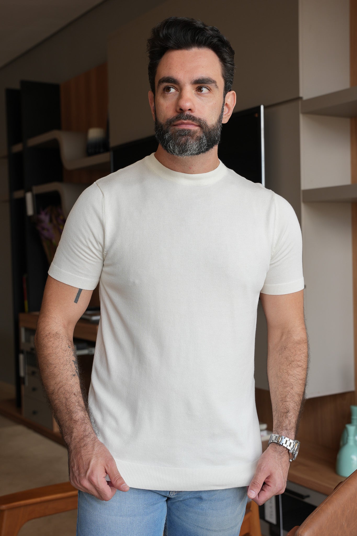 nove seu guarda-roupa com nossa exclusiva camiseta em tricô, a escolha perfeita para quem busca unir estilo e sofisticação em uma única peça. Feita com fios de alta qualidade, essa camiseta traz...